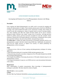Chair of Mining Engineering and Mineral Economics Franz Josef-Strasse 18, A-8700 Leoben www.unileoben.ac.at ANNOUNCEMENT BACHELOR THESIS Investigating the Potential of Low-Cost Photogrammetry…